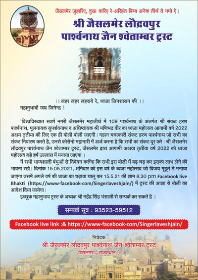 महानुभावों जय जिनेन्द्र ! 'विश्वविख्यात स्वर्ण नगरी जैसलमेर महातीर्थ में 108 पार्श्वनाथ के अंतर्गत श्री संकट हरण पार्श्वनाथ, मूलनायक सुपार्शवनाथ व अधिष्ठायक श्री मणिभद्र वीर का ध्वजा महोत्सव आगामी वर्ष 2022 अक्षय ततीया की लिए एक ही बोली बोली जाएगी । महान चमत्कारी संकट हरण पार्श्वनाथ जो सभी का संकट निवारण करते है, उनसे कोरोनो महामारी में अर्ज करना है कि सभी का संकट दूर करे | श्री जैसलमेर लौद्रवपुर पार्श्वनाथ जैन श्वेताम्बर ट्रस्ट, जैसलमेर द्वारा आगामी अक्षया तृतीया वर्ष 2022 को ध्वजा महोत्सव बड़े हर्ष उल्लास में मनाया जाएगा । मैं सभी भाग्यशाली बंधुओं से निवेदन करूँगा कि सभी इस बोली में बढ़ चढ़ कर इसका लाभ लेने की भावना रखे |